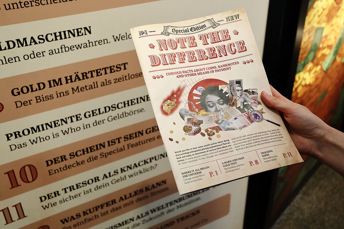 In a historically designed “wall newspaper,” “Note the difference” shows what money can be used for—namely, more than just for making payments. Visitors encounter curious facts and unexpected aspects of coins and banknotes and learn how much science is involved in our everyday means of payment.